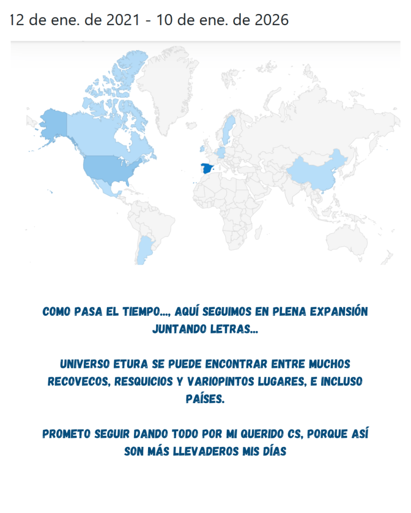 Gracias por todo, Etura. Siempre serás un rinconcito donde ser un poquito más yo y refugiarme de este extraño, pero apasionante, mundo. Este blog siempre será mi pequeño y privado universo en constante expansión, allí donde comparto mis recovecos, sincericidios y extrañezas.